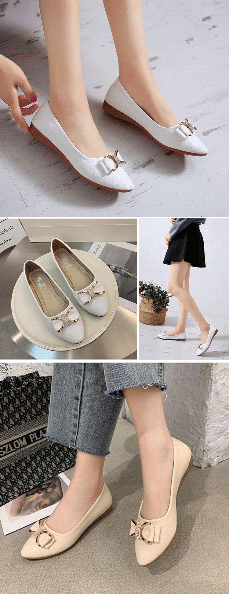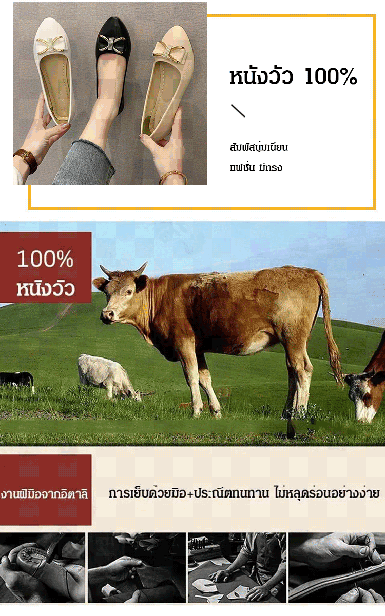 วัสดุหนังวัว พื้นรองเท้าแบน เดินไม่เมื่อย ไม่กัดเท้า ดีไซน์ติดโบว์ สวยงามลดอายุ