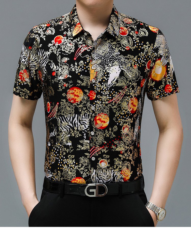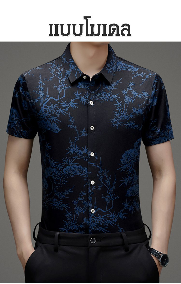 เสื้อเชิ้ตแขนสั้นผ้าไหมเย็นลายเท่ของผู้ชาย